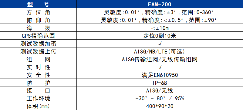 微信客服:(微信號)雙GPS天線姿態在線監控系統是欧宝体育自主研發的一款天線工參自動監測系統,結合先進的傳感器技術、控制技術、無線網絡技術和電源管理技術,無需人工現場采集,對基站天線的運行情況進行全天候監測,實現實時監測,避免人為誤差,并通過管理平臺實現全智能評估、高效管理。能夠幫助通信運營商提高工作效率、降低維護費用、預防倒塔等重大安全事故的發生。對推動遠程電調天線工作大有裨益。FAM-200可選AISG或NB/LTE組網方案,廣泛適配不同廠家的天線產品。